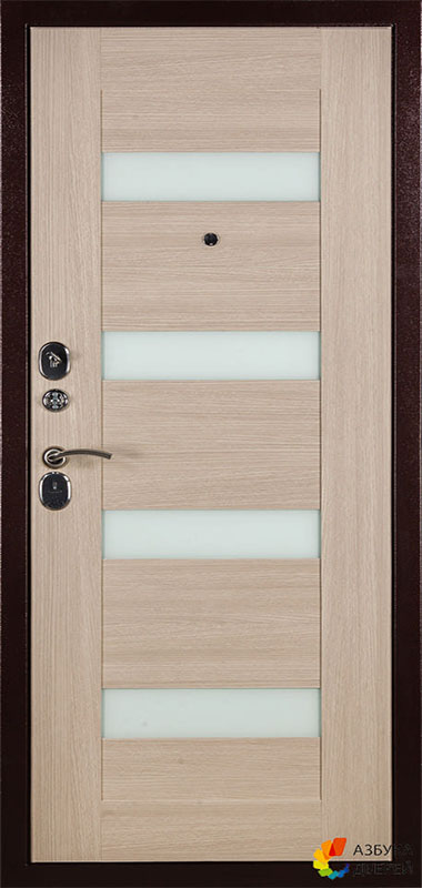 Металлическая дверь производства Россия. Трехконтурная, короб закрытый, утепленный толщина полотна 80 мм, цвет антик медь, цвет внутренней панели: Меланж светлый, Венге кантри. Дверь комплектуется двумя замками Гардиан с накладками.